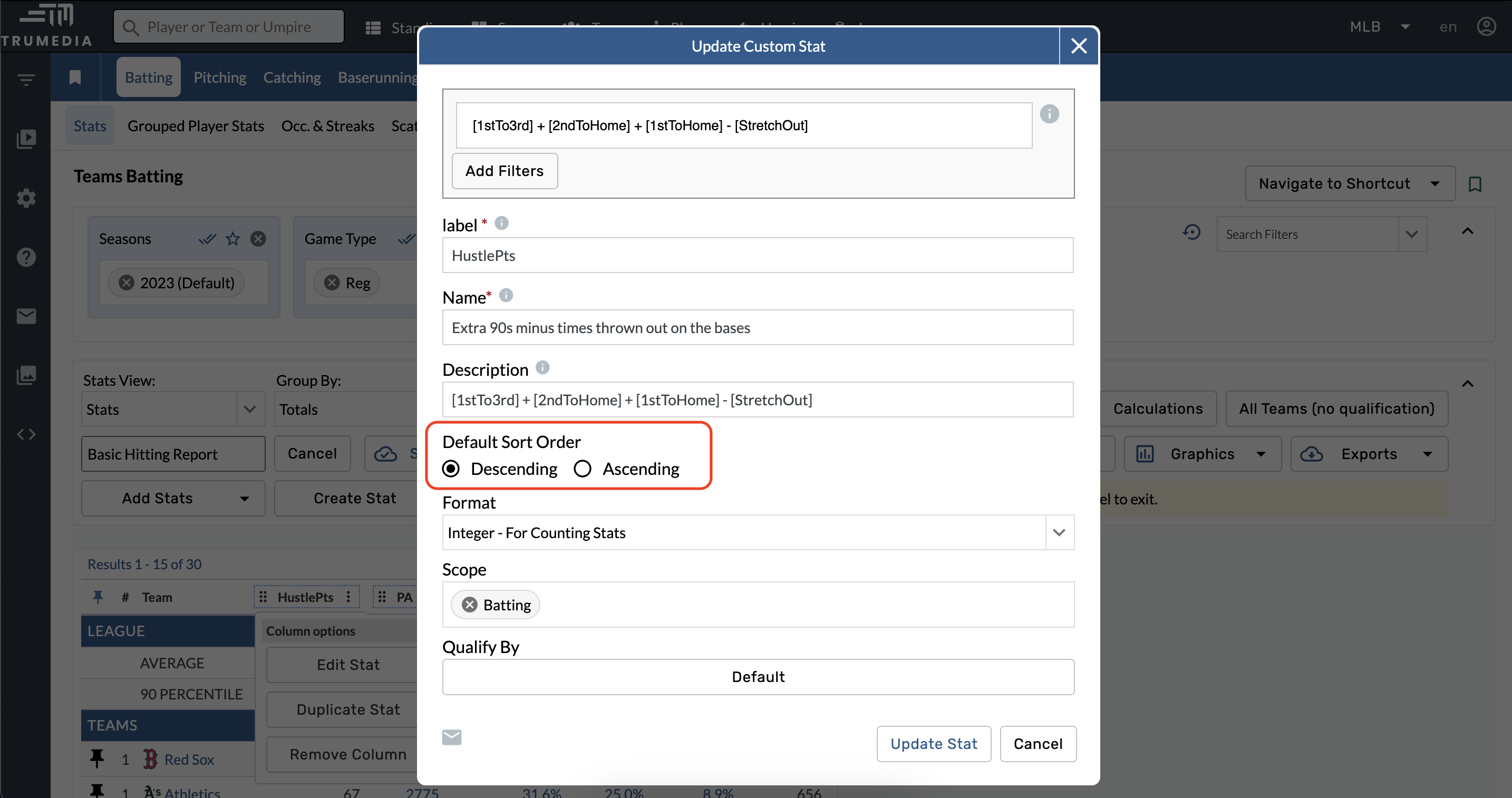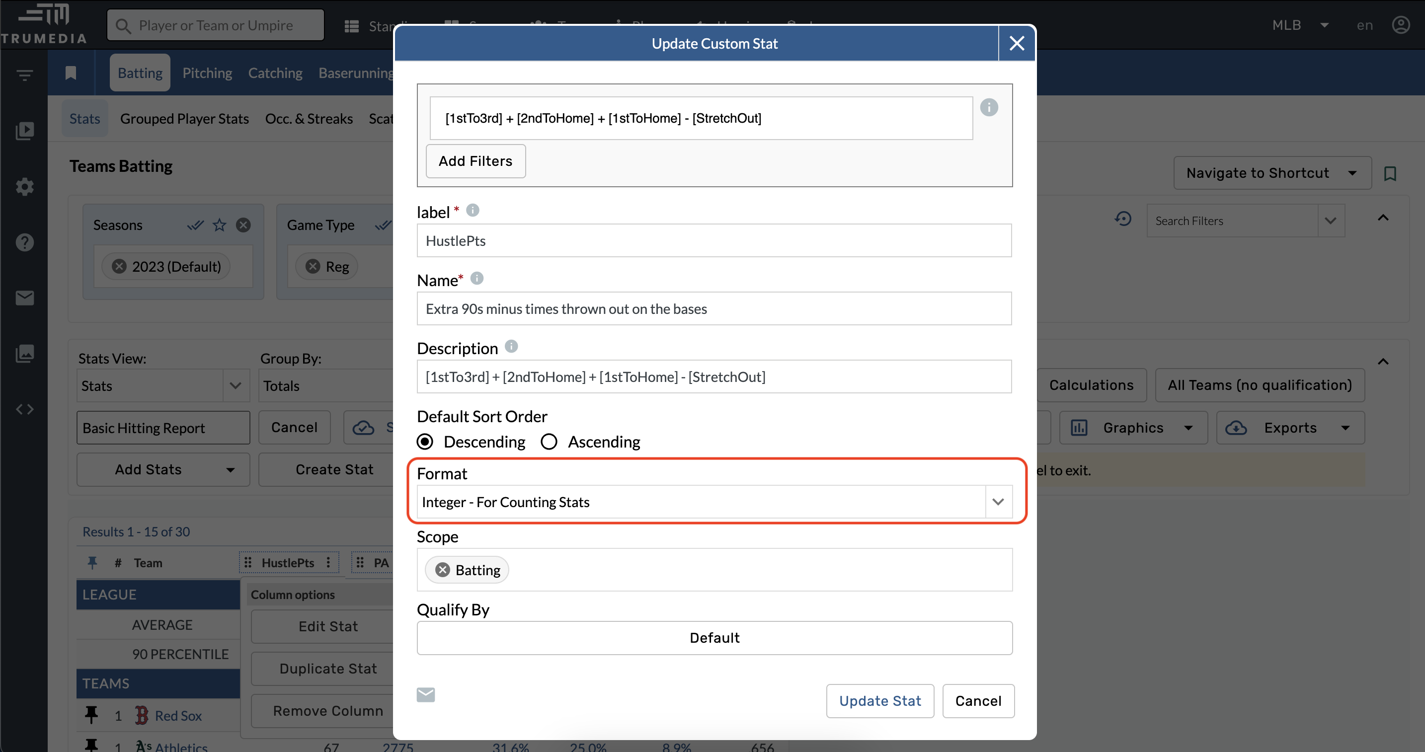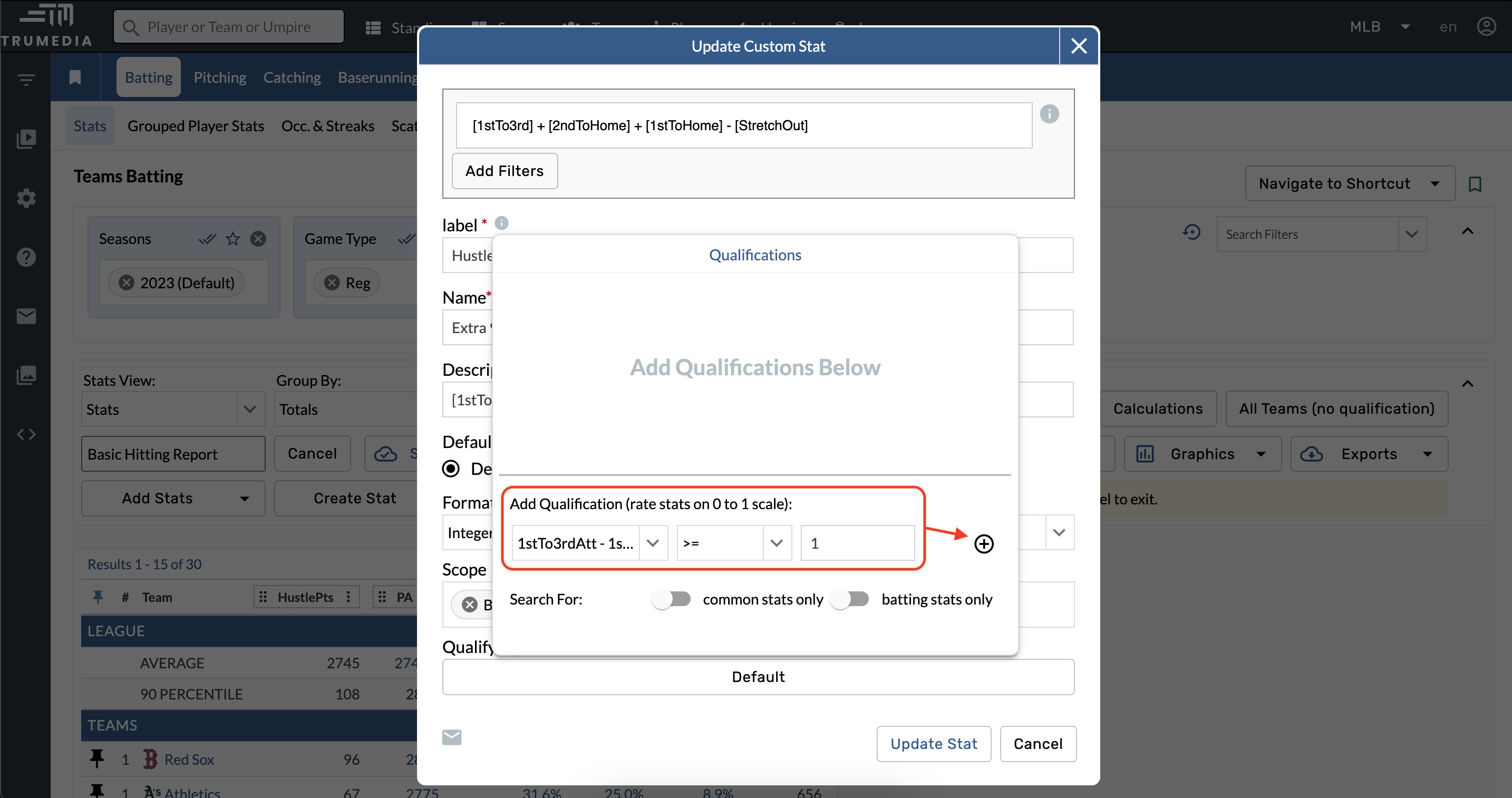 Este ejemplo de estadística de abajo está configurado para calificar a cualquier jugador que tenga una o más oportunidades de ir de primera a tercera en un sencillo.