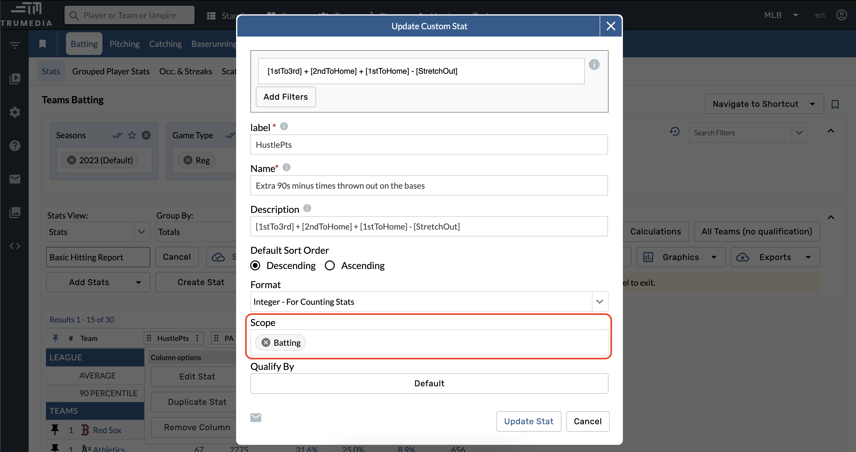 Cada aspecto del juego (bateo, lanzamiento, etc.) se considera un alcance único en TruMedia. Esta selección de un alcance determina donde se puede utilizar esta nueva estadística. Elige Todos para que la estadística esté disponible para cualquier informe.