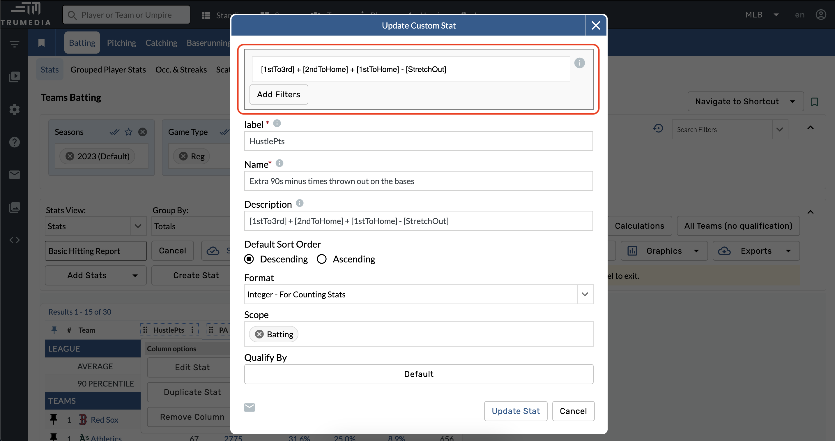Each aspect of the game (hitting, pitching, etc.) is consider a unique scope in TruMedia. This selection of determines which reports this new stat is available to add on.