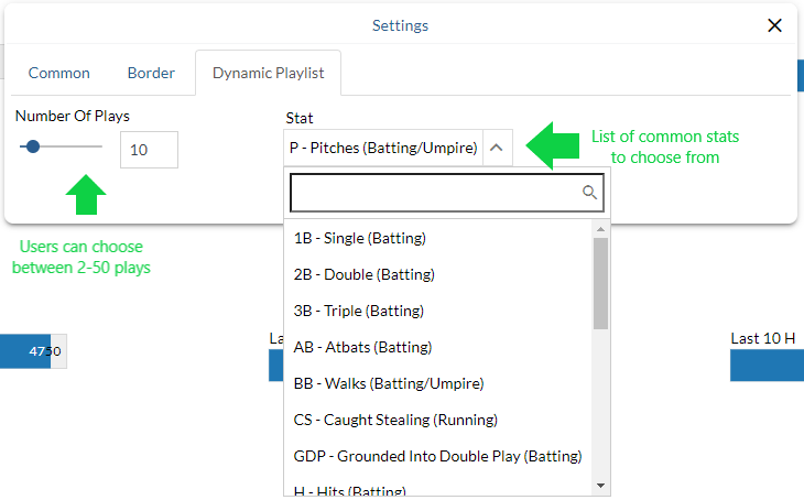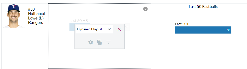A new component has been added on Custom Pages that allows users to create dynamic playlists and apply filters to show recent events such as Last 10 Singles with RISP, Last 25 Fastballs over 93 MPH, etc.