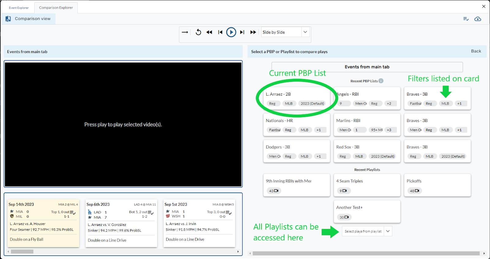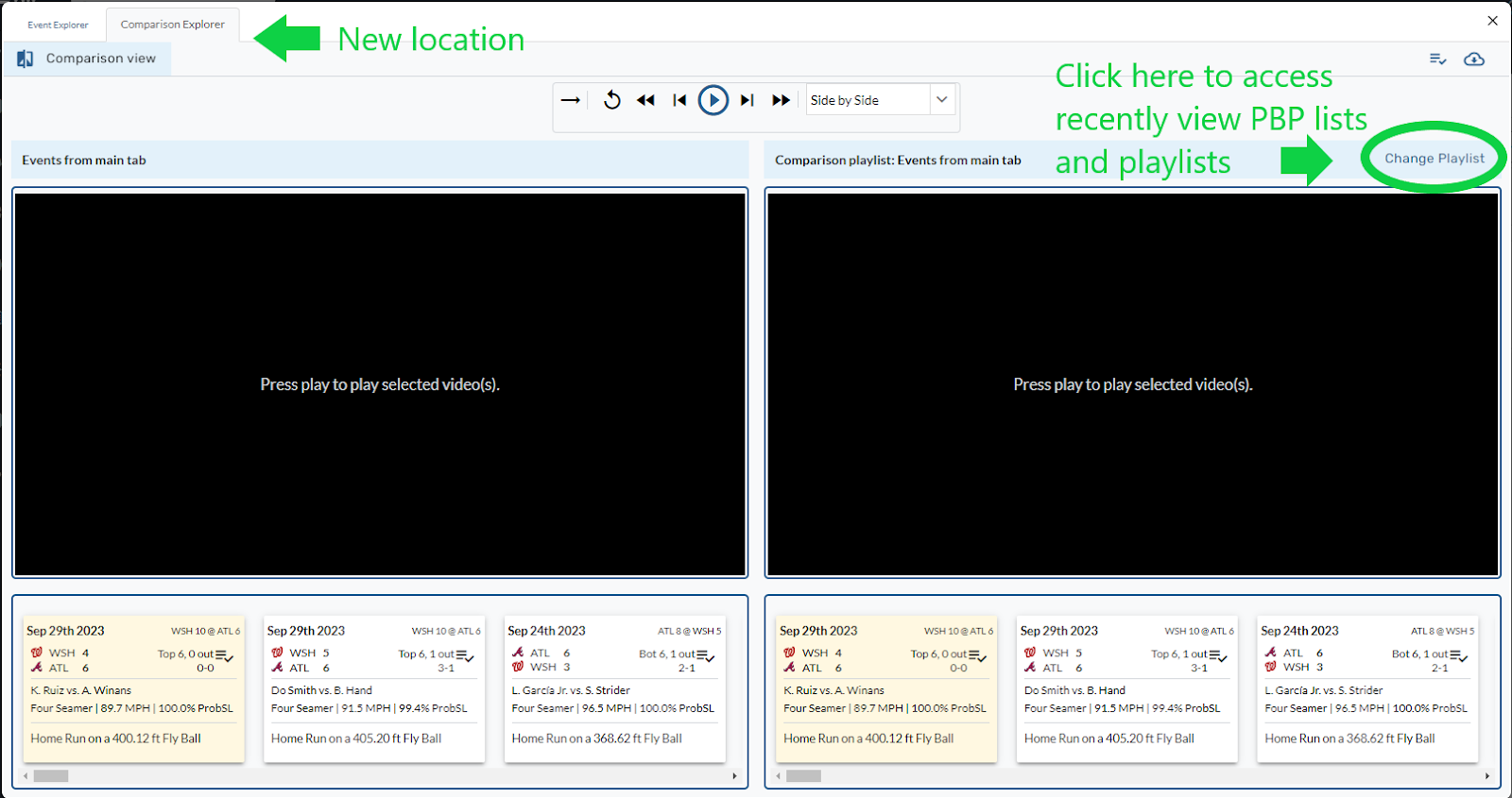 Recently viewed PBP (play-by-play) video lists are now accessible in Comparison View. To open a recently viewed list, select “Change Playlist” in the top right of the right-side video player.