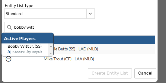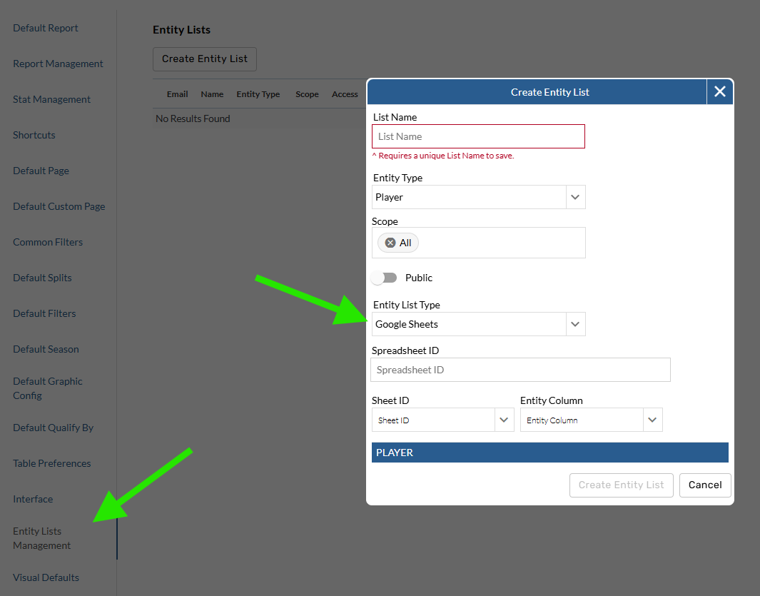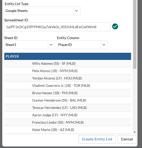 Data pro customers can now power entity lists with Google Sheets. Connecting entity lists to google sheets makes it possible to view and easily update pref and watch lists that are created in your organization's internal system. When players are added to watch and pref lists in your internal system they can be quickly and automatically reflected in your TruMedia site by connecting that internal site list to the Google Sheets.