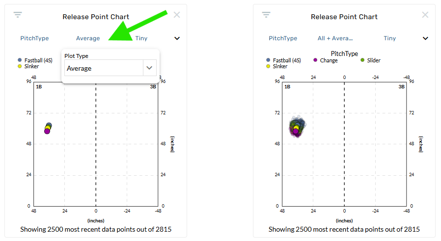 You can now chart Average Pitch Type points and Average + All with a new Plot Type control on Release Point charts.