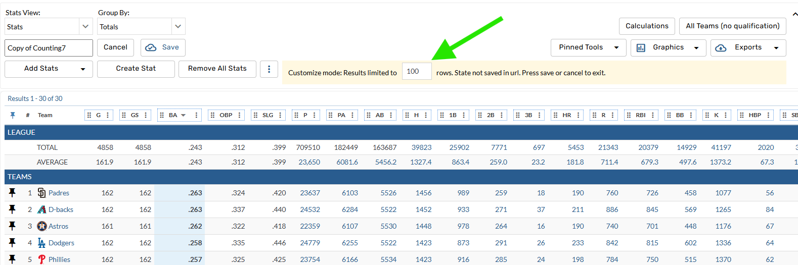 Customize mode can now show up to 100 (configurable) rows, so the entire league can be shown while in customize mode for MLB or MiLB. You won't have to save temporary reports as often if you just want to check 1 new stat.