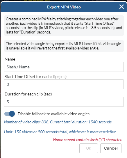 "Name cannot contain slash" message added to video service exports
