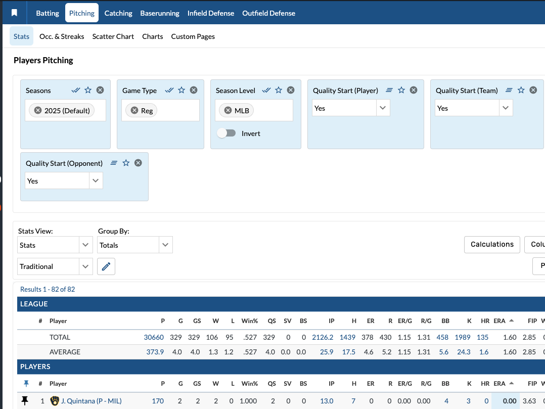 3 New Quality Start filters: Quality Start (Player), Quality Start (Team), and Quality Start (Opponent).
