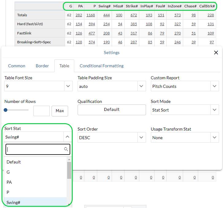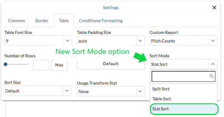 A new Sort Mode option has been added to Splits Tables to allow users to select a sort order stat for the report without leaving the Custom Page Builder.