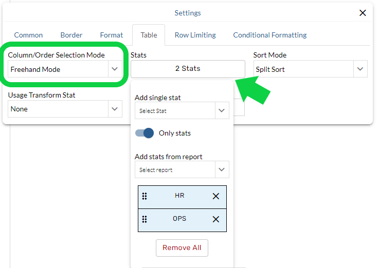 You can now power custom pages tables with stats with a new freehand selection mode. Stats can also be pulled from a report and edited from there. It is important to note that these freehand stat "reports" are not saved anywhere besides the respective custom pages table.